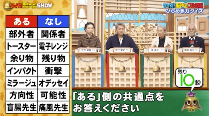 次は、あるなしクイズ。次の単語の「ある」側の共通点を答えてください。