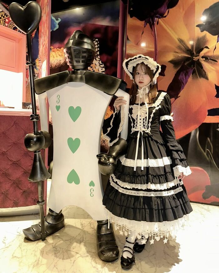 別の写真では、トランプをモチーフにした兵隊の像と腕を組み、少し儚げな表情でカメラをじっと見つめる姿も。
