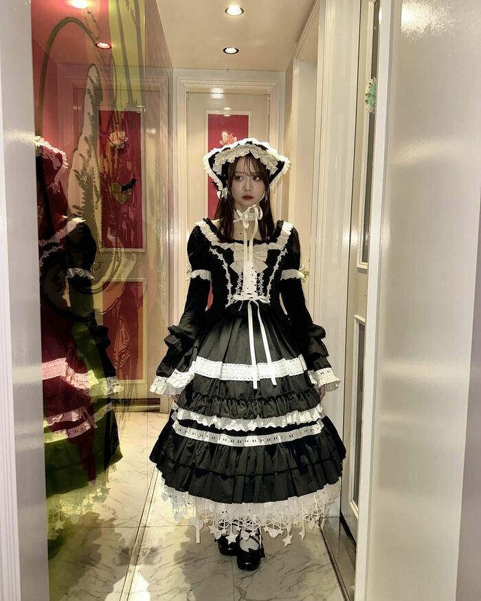 写真では、胸元の大きなリボンが印象的な黒と白のフリルワンピースを着た森さんが、目線を外してポーズを決めている姿が!