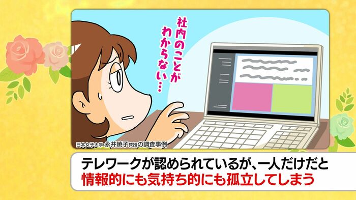 「育児中はテレワークを認められているけれど、他のメンバーが社内にいるので気持ち的にも情報的にも孤立してしまう」という、悩みも紹介されました。
