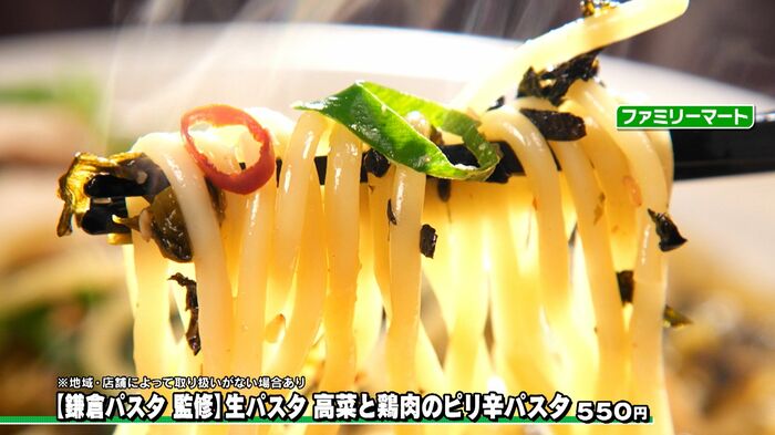 続いても鎌倉パスタ監修の商品、「【鎌倉パスタ監修】生パスタ 高菜と鶏肉のピリ辛パスタ(550円)」。