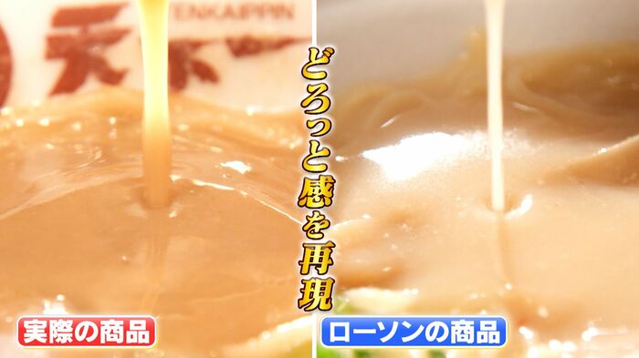 そんな“こってりスープ”を、『天下一品』監修のもと、ローソンが実に1年半の歳月をかけて再現。実際に天下一品で提供しているラーメンと見比べてみても、濃厚スープのどろっと感がしっかりと再現されています。