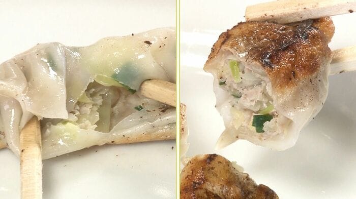 中には豚と牛のひき肉と、キャベツ、白菜、玉ねぎ、ニンニク、生姜、ニラの6種類の野菜が入っていて、厚さ0.6mmの薄い皮で包みます。