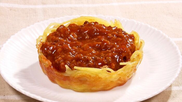 焦げ目のついたきれいなパスタの器も作れて、中にミートソースを入れた面白い食べ方もできるんです。