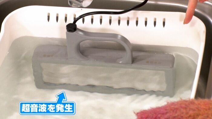 水を張ったシンクに本体を入れ電源を入れるだけで、洗剤を使わずに食器の汚れが落ちる、超音波を利用した食洗機です。