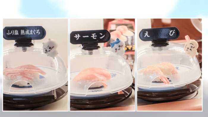 くら寿司のお皿の上に寝そべったちいかわやハチワレ、うさぎ、くりまんじゅうの背中にネタが乗っています。