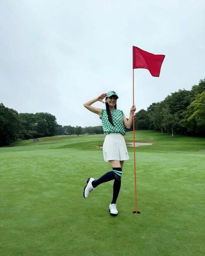 公開された写真では、緑の花柄があしらわれたノースリーブトップスに白いミニスカートのゴルフウェア姿でポーズを決めるあ~ちゃんの姿が!