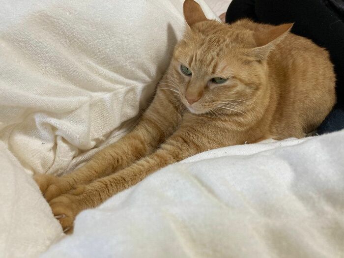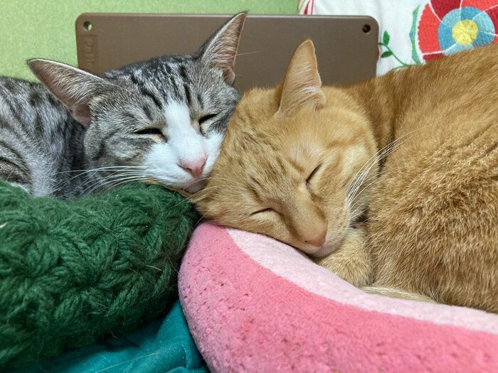 一緒に仲良くくっついて寝ている場面も見られますが、明るく元気なサバシくんをうっとうしがることもしばしばあるそう。