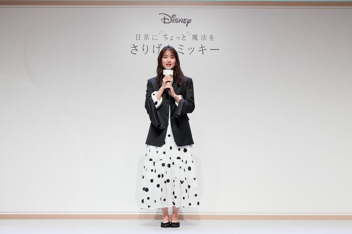 自身の衣装について、「すごくかわいくてドットのところにミッキーが隠れていたりして、お気に入りです」と紹介しました。