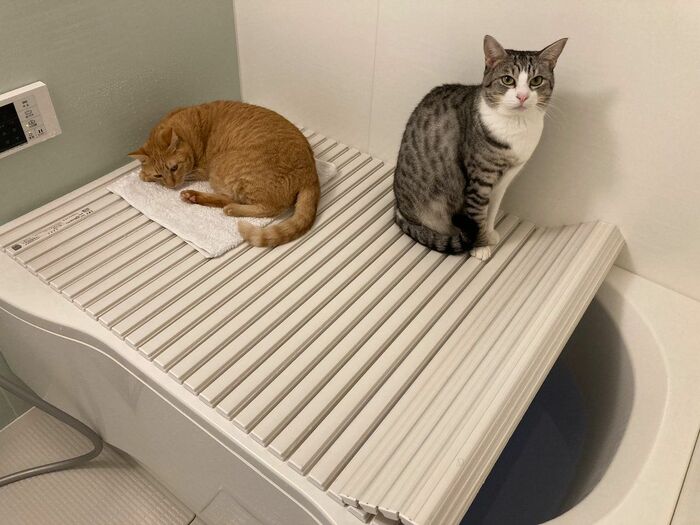 しかし、飼い主さんがシャワーを浴びてからあがるまで静かに寝ているこいもちゃんとは異なり、サバシくんは落ち着きがないようで、ゆっくり過ごせることは難しいそうです。また、フタの上にいる頻度が多いのはこいもちゃんだといいます。