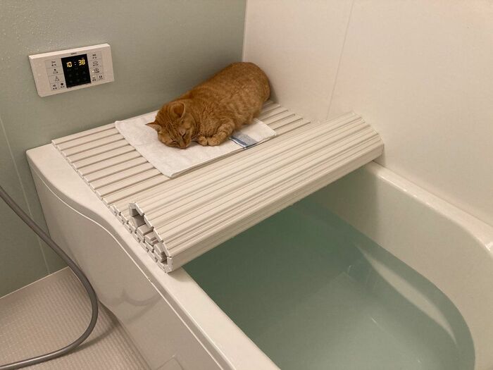「これがニンゲンに入ることが許されるスペース」と飼い主さんが湯船に浸かろうとした時の写真が公開され、話題を集めています。