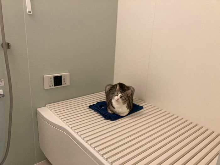 実は、お風呂のフタの上にやってくるのは、サバシくんもなんだとか!同様に敷きタオルの上にちょこんと座っていました。