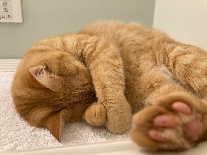 湯船に浸かりながらの至近距離ショットを見ると、前足に顔をうずめたこいもちゃんは、かなりぐっすり寝ていることがうかがえます。お風呂に入りながら、愛猫を眺められるのは究極の癒やし時間ですね。