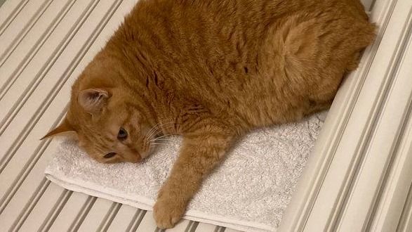 投稿を見ると、お風呂のフタの上に敷かれたタオルの上で、気持ちよさそうに寝転ぶこいもちゃんの姿が!