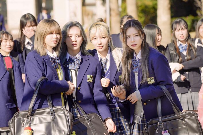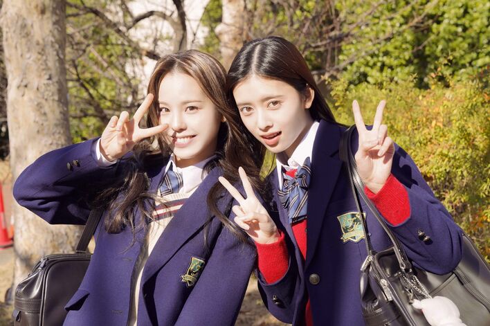 W主演の宮世琉弥さん、原菜乃華さんらと同じ高校に通う生徒役として、他の出演者らと同じ制服を着こなしたNiziU。映画の世界に溶け込んだ演者としてのメンバーの表情に注⽬です!
