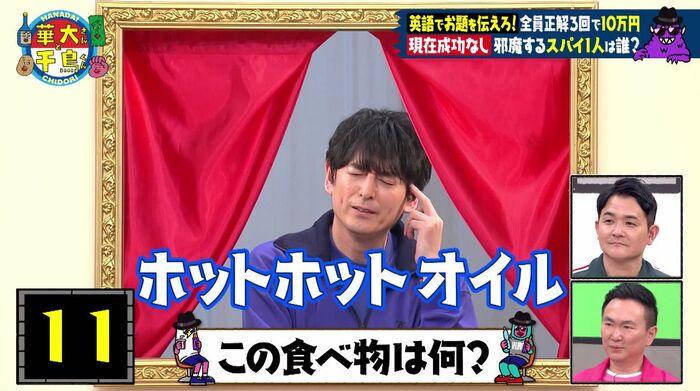 さらに、出題側で大吉さんは「オイル」「ホット」「シュリンプ」「ポテト」「フィッシュ」という単語を使って「天ぷら」を伝達するも…華丸さんが「エビチリ」、田中さんが「エビフライ」、ほか「アヒージョ」と答えて、一致ならず。