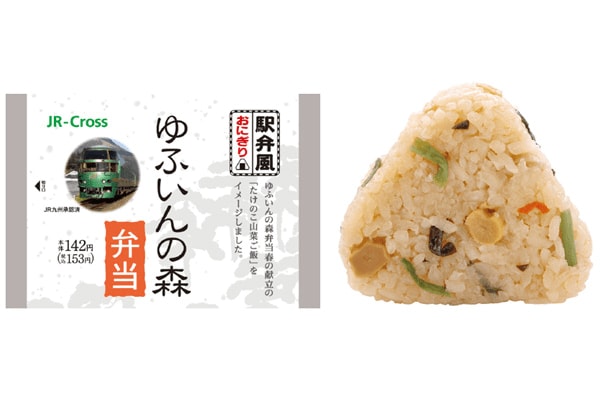 博多駅~由布院駅を結ぶ、特急「ゆふいんの森」で販売されている「ゆふいんの森弁当」のたけのこ山菜ごはんをイメージしたおにぎりです。