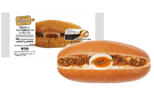 「阿蘇」と「遊ぼう」の2つの意味が込められている特急「あそぼーい!」で提供される「くろちゃん弁当」をイメージしたパン。ドッグロールに、大豆ミートのキーマカレー、コーン入りポテトサラダをはさみ、スライスたまごがトッピングされています。