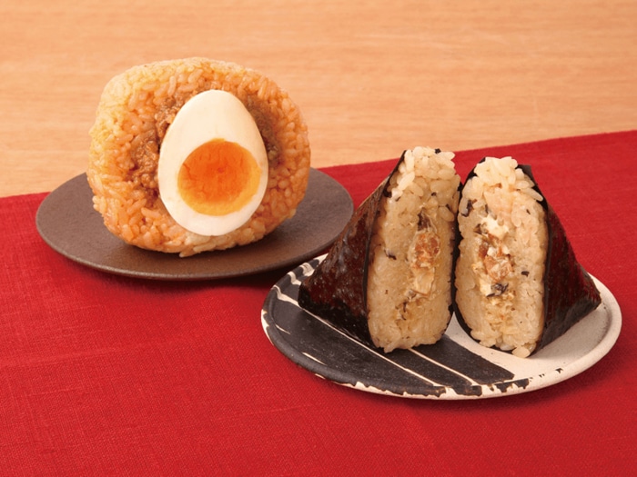 「極からか麺」風のおにぎりは、豚骨だしご飯に辛みのある肉そぼろを合わせ、塩味のゆでたまごがトッピングされています。辛みの中に豚骨だしの旨みが感じられる、コク深い味わいがたまりません!