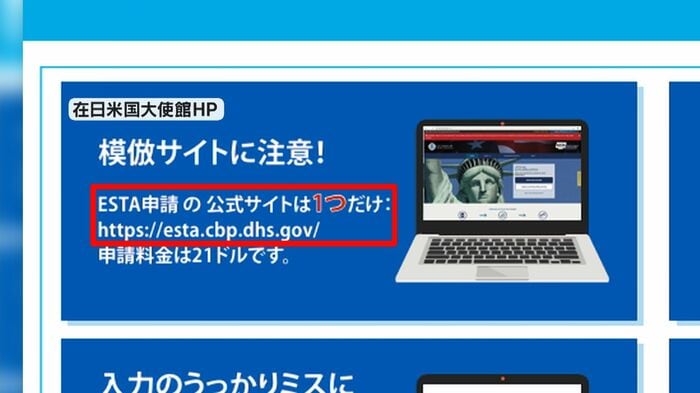 ESTA申請をめぐっては、在日アメリカ大使館のサイトにも「模倣サイトに注意!」「公式サイトは1つだけ」という文字と共に公式の申請ページのURLが示されています。