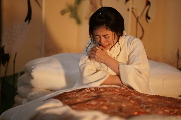 急に産気づいた五十宮倫子(小芝風花)を心配し、徳川家治(亀梨和也)が駆けつける。子を産むにはまだ早い時期で、家治は倫子に手を伸ばすも、その手を倫子に退けられてしまう。