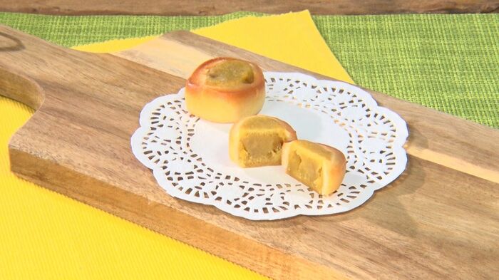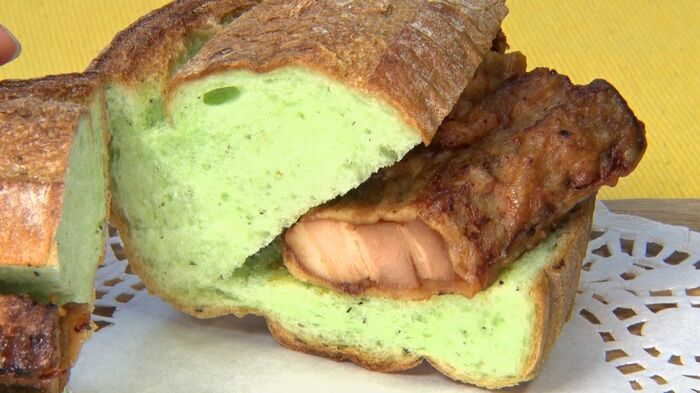ソフトフランス生地には小松菜ペーストを使っており、中は鮮やかな緑色になっています。