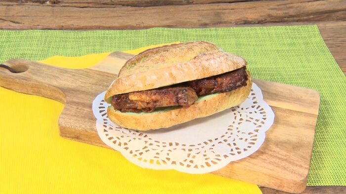 柚子胡椒の隠し味で味付けした角煮をサクッと揚げて、有機野菜を練り込んだソフトフランスでシンプルにサンド。