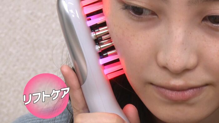 皮膚をケアするLEDコームと、筋肉を刺激するEMSコームが細かく振動し、頬にあてると硬くなりがちな表情筋をほぐしながら顔全体をリフトケアできるんです。