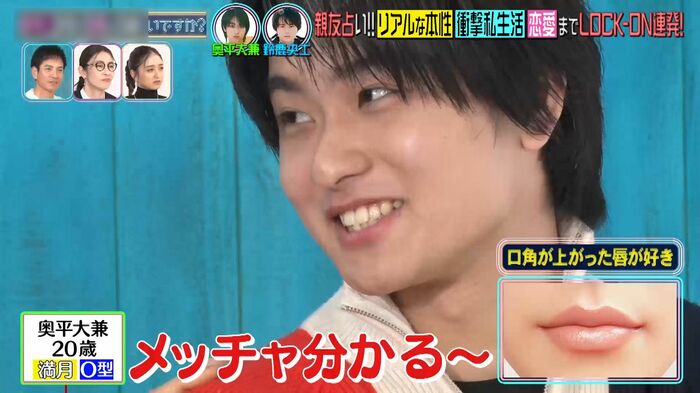 さらに「女の子の放つ匂いにやられちゃう。顎のラインが好き」と告げられると、鈴鹿さんは「唇も好き」と告白しました。奥平さんは、星さんいわく「口角がキュッと上がった唇が好き」だそうで、奥平さんは「メッチャわかる〜!」とニッコリ。