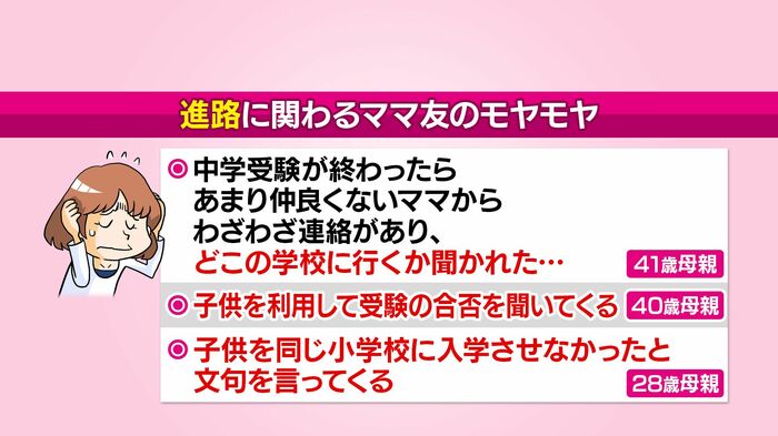 「中学受験が終わった途端、あまり仲が良くなかったママから結果を聞かれた」「同じ小学校に入らないのかとママ友から文句を言われた」など、進路に関わるモヤモヤを感じている人も多いよう。