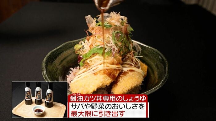 鯖カツ丼のために開発された専用の醤油で食べる“鯖醤油カツ丼”