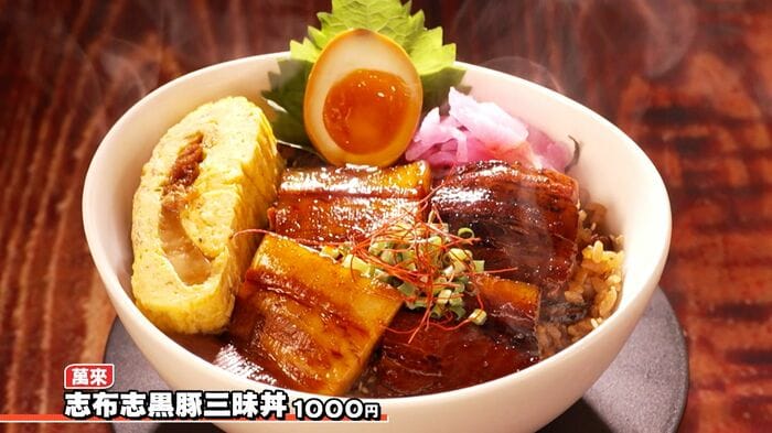 1品目は、鹿児島県産の黒豚をじっくり丁寧に煮た、とろける柔らかさの角煮の「志布志黒豚三昧丼」。