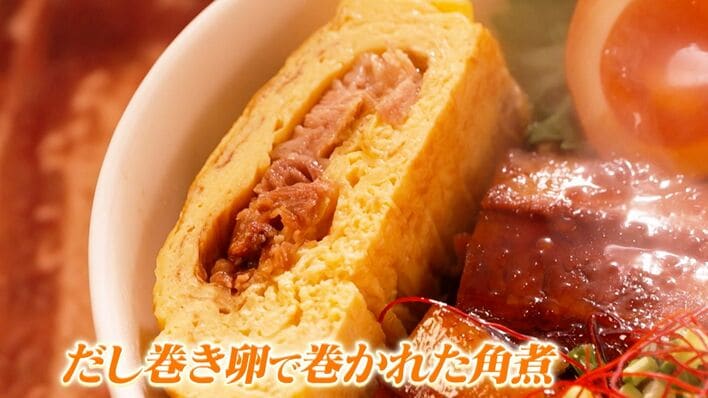 角煮は鹿児島県産の黒豚を1日かけてじっくり煮込むことでとろける柔らかさに。甘めのタレと、ジューシーな脂がマッチして濃厚な味わいに仕上がっています。