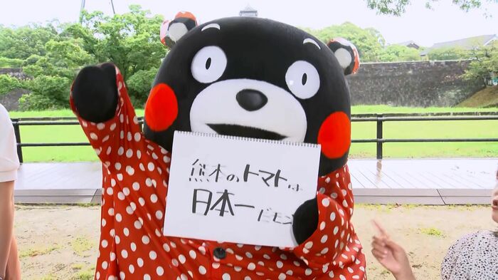 トマピーエンについて『熊本のトマトは日本一だモン』とフリップを使って伝えてくれたくまモンに「熊本のトマトは味のバランスが良いんですよね」と緒方さんがすかさずフォロー。