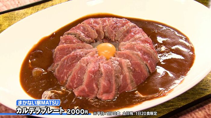 続いては、阿蘇の地形の特徴であるカルデラをイメージした土台のご飯にあか牛を贅沢に並べ、さらにハヤシソースをかけて食べる「カルデラプレート」。