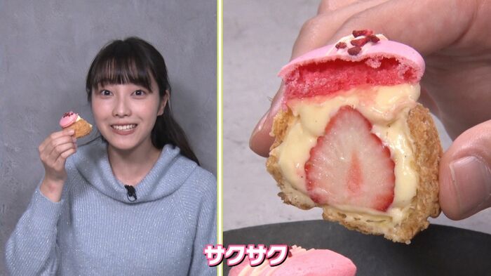 サクサクとしたクッキーシューの中には、砂糖を減らしたことで口溶けを良くしたクリームと、豪快に生のイチゴがまるごとひとつ入っているんです。