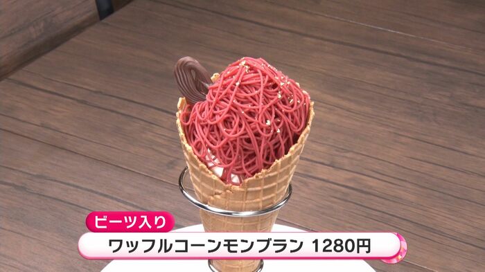 原宿・TheBeetでは美容効果に良いとされるビーツを扱った専門店で、特に人気なのが目の前でモンブランをかけてくれる「ワッフルコーンモンブラン」。