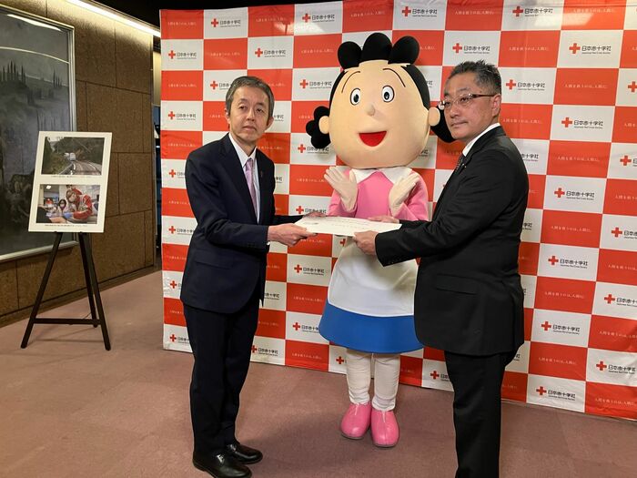 2月29日(木)午前10時から東京都港区の日本赤十字社で贈呈式が行われ、フジテレビの吉川裕介(執行役員社会貢献推進局長)から日本赤十字社の相澤達也パートナーシップ推進部長に5億2,386万566円の義援金の目録が手渡されました。