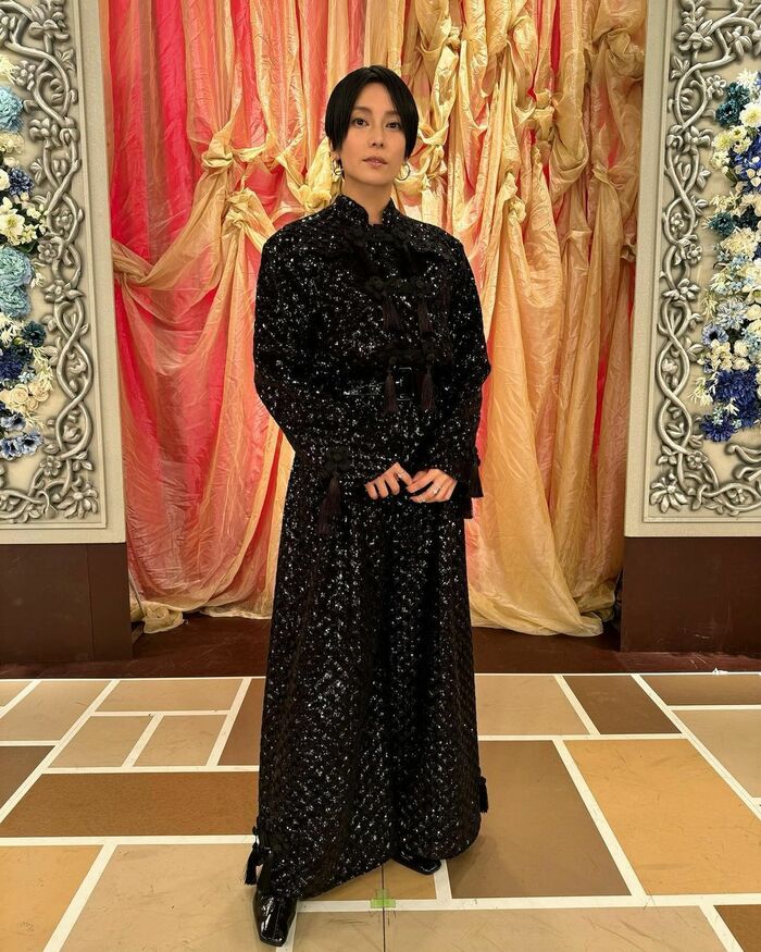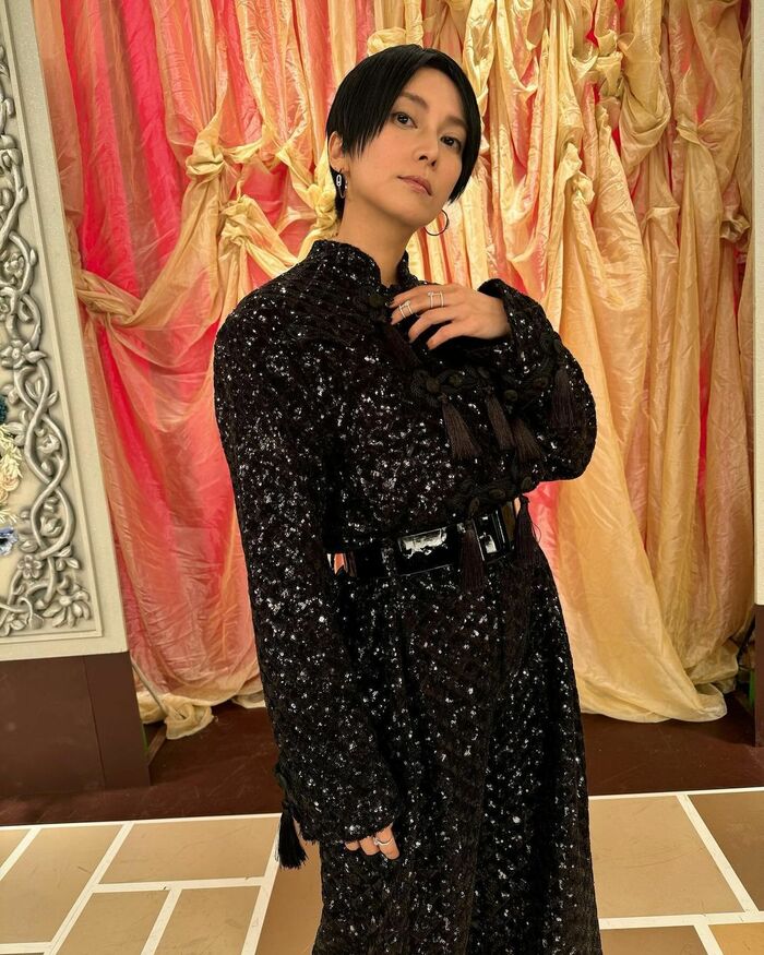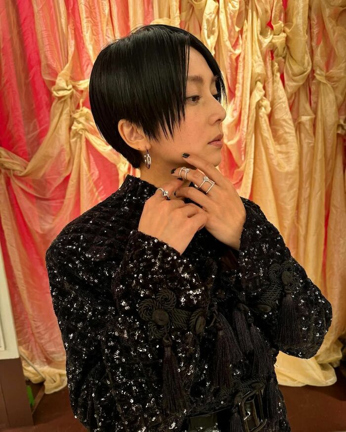 黒髪ショートのヘアスタイルも相まって、洗練された大人の雰囲気あふれるスタイルを披露しています。