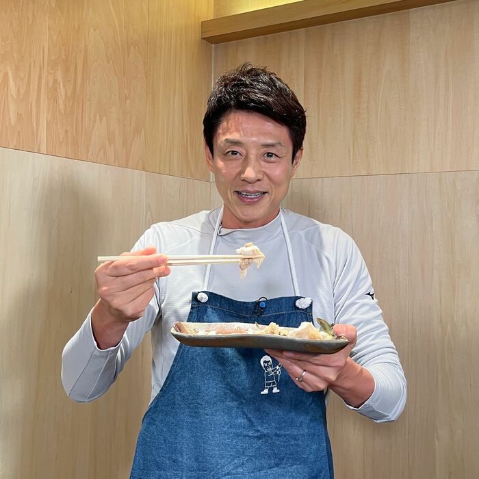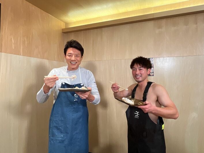 小枝さんは、たくましい肉体に“漁師カッパ”姿でポーズを決めると、手際よくカワハギの頭の部分に切り込みを入れ、「ここからはもう包丁は使わずに、手で作業していきます」と宣言。カワハギの調理は包丁ではなく手を使うことが一般的とのこと。