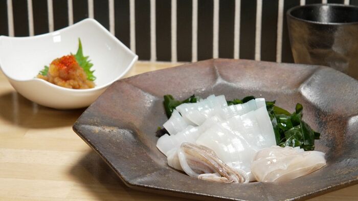 鰺ヶ沢のヤリイカは、漁場が港から20~30分と近いため、より新鮮な状態で水揚げされるそう。葛西さんは「部位によって食感が全然違います」と語り、キラキラと輝くような「ヤリイカの刺身」を松岡さんに勧めてくれます。