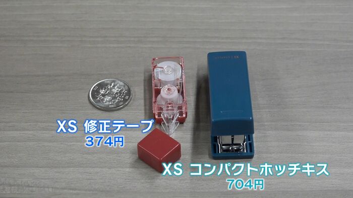 まずは、100円玉よりも幅が狭いホッチキスと修正テープ。