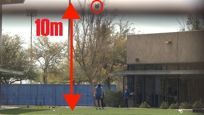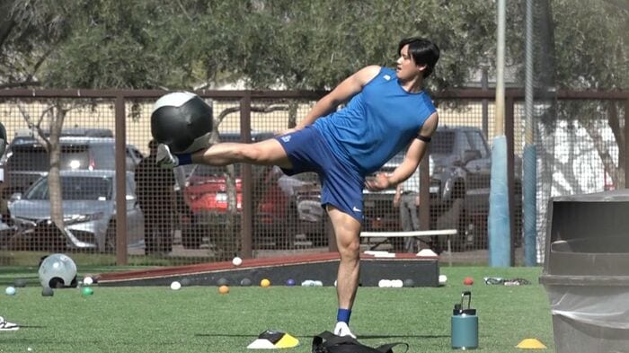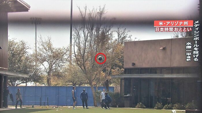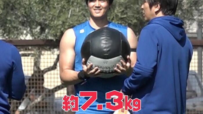 実際に大谷選手がメディシンボールを投げている映像を見てみると、重さ約7.3キロのボールが10メートルほどの高さまで宙を舞いました。
