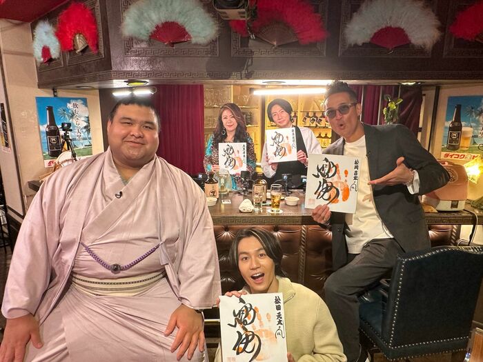 相葉さんの顔よりも大きな手形に驚がくし、「それで張り手だもんね…」と興奮さめやらぬまま、相撲を始めたきっかけなどの話に。