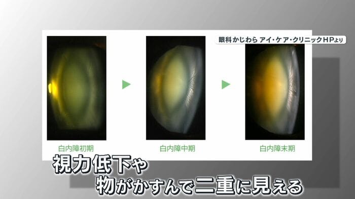 黒目が白く濁り、視力の低下や物がかすんで二重に見えたりする「白内障」。