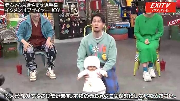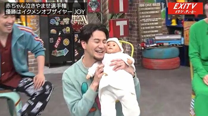 三者三様の泣きやませ方でしたが、兼近さんが選んだ「一番あやし上手な人」はJOYさんに決定。JOYさんは喜びのあまり、赤ちゃん人形をりんたろー。さんから受け取ると、喜びのトライを決めました。