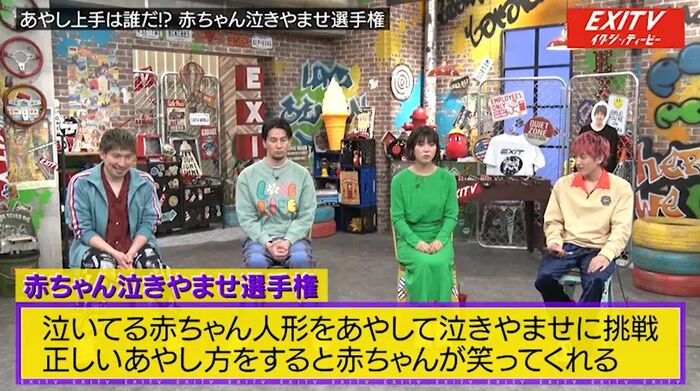 ベビーシッター経験のある兼近さんが審査員を務め、「イクメン オブ ザ イヤー2021」のJOYさん、チャラ男キャラからイクメンキャラへの進化を狙うりんたろー。さん、溢れ出る母性とメロディのダークホース・眉村さんが、赤ちゃん人形を使った泣きやませで競い合うことに。
