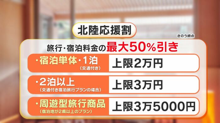 能登半島地震の影響を受けた北陸の観光事業者を支援するため、北陸4県への旅行が最大50%割引となる「北陸応援割」。
