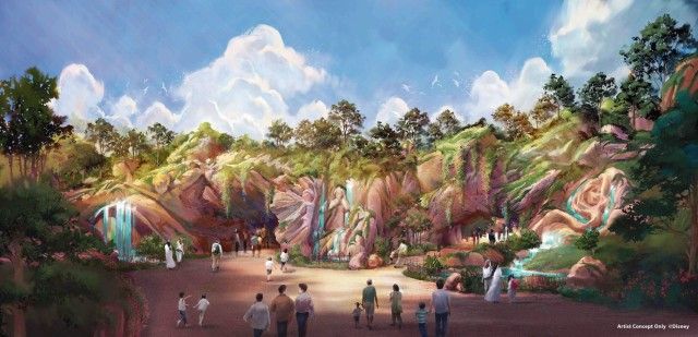 他にも様々なキャラクターが岩で表現された魔法の泉があり、訪れたゲストをディズニーファンタジーの世界へ誘います。