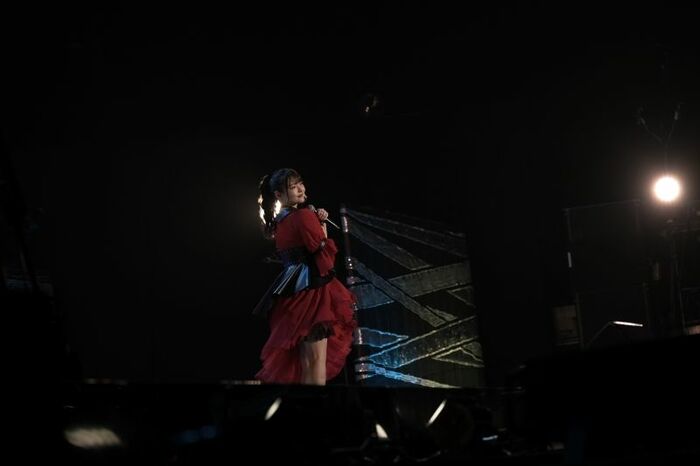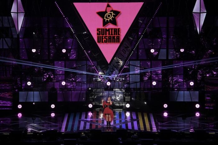 紹介VTRが流れると、「待ってました!」と言わんばかりの歓声と赤いペンライトが会場を埋め尽くすなか、赤色のドレス姿で上坂すみれさんがステージに登場。1曲目は「ハッピーエンドプリンセス」。コミカルな雰囲気の同曲は、上坂さんの魅力を目一杯引き出した1曲で、会場からの声援にも熱が入ります。